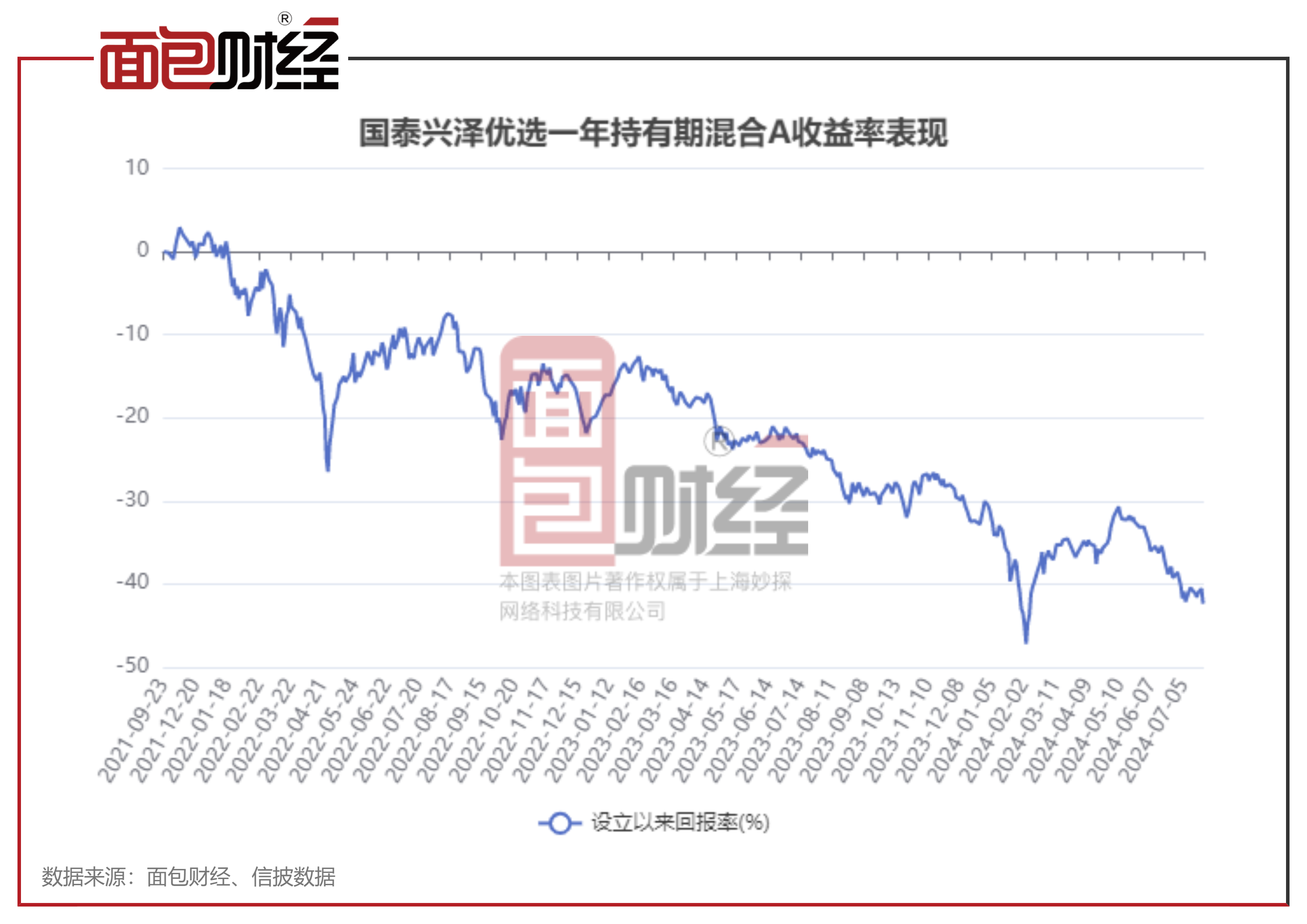 截至2024年7月23日,国泰兴泽优选一年持有期混合A成立以来净值累计下跌42.39%,跑输业绩比较基准超过20个百分点。