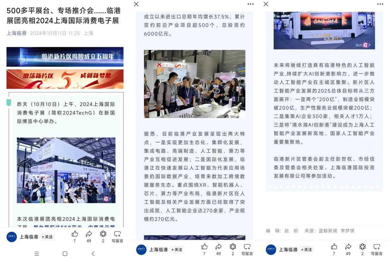 松江区经委、区投资促进服务中心携手区内12家电子信息产业智能终端企业打造了上海松江展台。在展区现场,上海市松江区经委主任、商务委主任陈超告诉蓝鲸新闻,展台集中展示了消费电子行业前沿资讯及最新科技成果。“作为市区协同发展两大细分赛道之一,松江区电子信息产业智能终端细分赛道产业基础扎实,在行业智能终端、智能机器人、信创终端、虚拟现实交互终端领域皆有重点企业(产品)布局,已经形成一定的发展优势。”