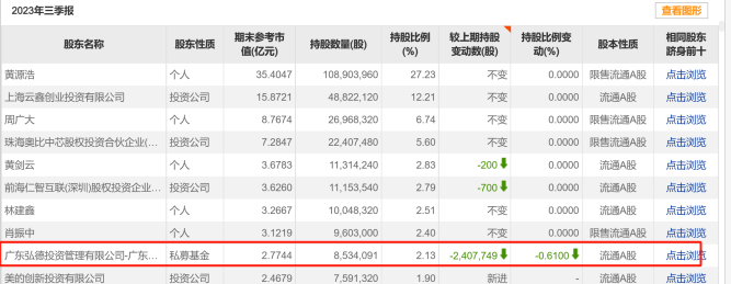 另外,作为公司的创始机构股东、关联方—广东弘德投资管理有限公司(下称“广东弘德”)在2023年三季报披露减持240万股,而2023年年报已经看不见其身影。据资料显示,公司董事、首席财务官陈彬此前任职广东弘德投资总监,独立董事傅冠强任职广东弘德副总经理。