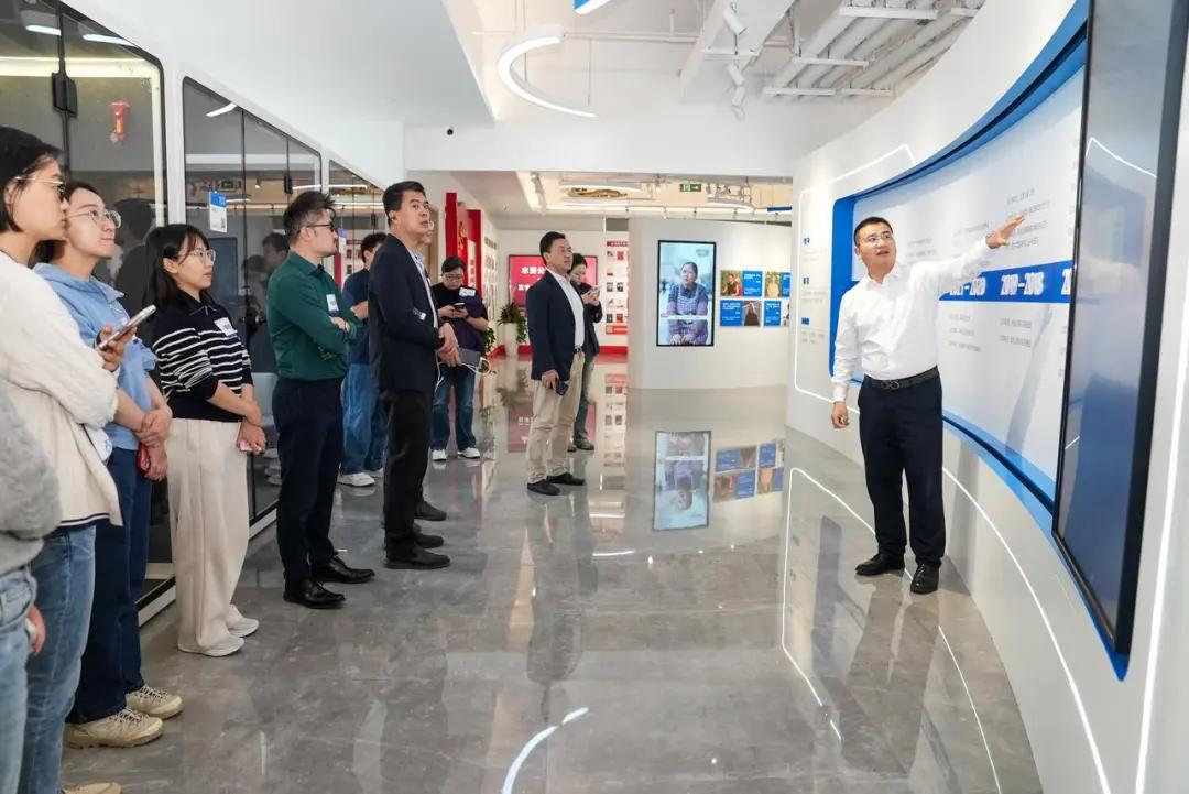 在水滴公司工作人员的引导下,师生们首先参观了企业展厅。通过实物展示、数据可视化大屏和场景化演示,大家了解了水滴公司自成立以来的发展历程、核心业务板块布局,以及在大病救助、普惠保险、医药创新等领域的实践成果。展厅中展示的水滴筹救助案例、水滴保AI全流程服务体系、翼帆医药临床试验数据等内容,让同学们直观感受到了科技如何赋能普惠保障,也对水滴"用互联网科技助推广大人民群众有保可医,保障亿万家庭"的使命有了更深刻的理解。