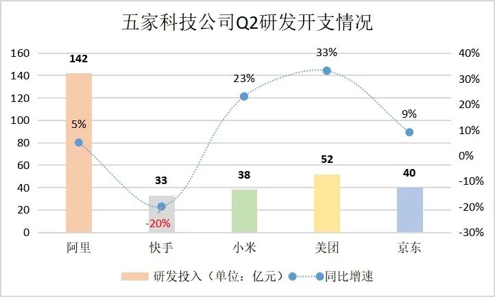 除腾讯财报制表没有科研投入一项外,可以看到,五家科技公司中,仅有快手一家科研投入同比下滑20%。