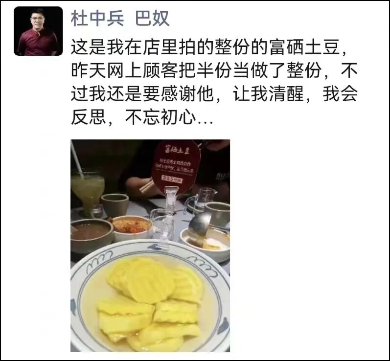 2月23日,巴奴毛肚火锅创始人杜中兵发了一条朋友圈,配文:“这是我在店里拍的整份的富硒土豆,昨天网上顾客把半份当做了整份,不过我还是要感谢他,让我清醒,我会反思,不忘初心。”