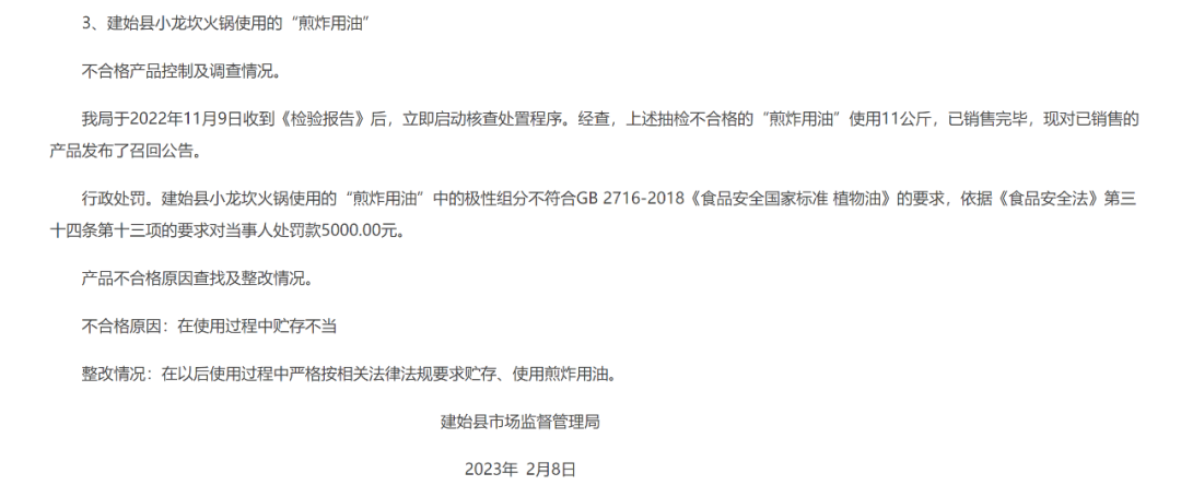 值得注意的是,小龙坎老火锅曾多次抽检不合格。据建始县市场监督管理局 关于抽检不合格食品核查处置情况的公告显示,建始县市场监督管理局于2022年10月10日至10月17日组织的食品安全监督抽检,其中3批次不合格,小龙坎老火锅赫然在其中。报告显示,建始县小龙坎火锅使用的“煎炸用油”中的极性组分不符合GB 2716-2018《食品安全国家标准 植物油》的要求,依据《食品安全法》第三十四条第十三项的要求对当事人处罚款5000.00元。而产品不合格的原因是在使用过程中贮存不当。