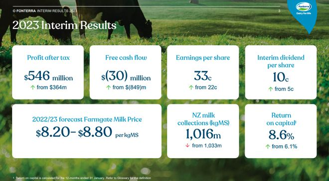 据财报显示,2022年8月1日至2023年1月31日,恒天然税后利润为5.46亿新西兰元,相较于2022财年中期增长了1.82亿新西兰元,同比增长50%,每股收益为0.33新西兰元;过去12个月的资本回报率为8.6%,高于去年同期的6.1%。