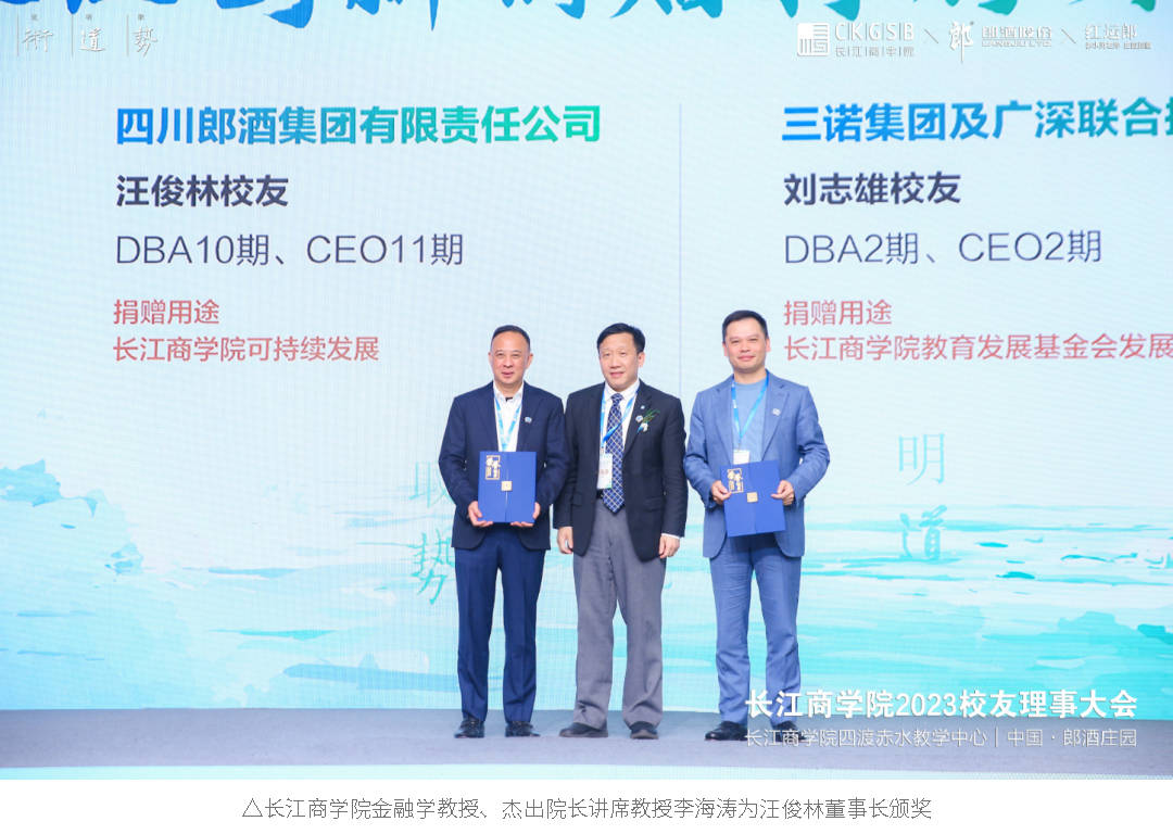 前沿智慧碰撞后,长江商学院现场表彰了近来支持学院可持续发展、支持校友成长发展以及践行社会公益的组织与个人,郎酒集团董事长汪俊林荣获“长江创新捐赠特别贡献者”。