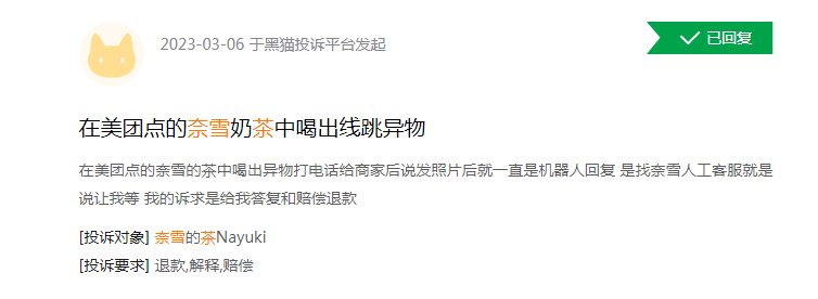 3月6日,网友投诉称,在美团下单,93元买的奈雪的茶,喝出异物。