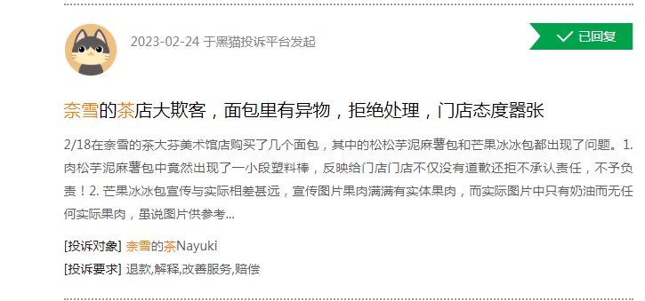 黑猫投诉平台上,奈雪的茶投诉超千条,集中于食品安全及虚假宣传等。近两年,奈雪的茶也因为虚假宣传及产品质量问题多次被罚。