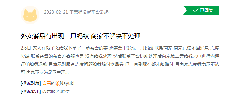 2月21日,在饿了么下单奈雪的茶,奶茶盖里发现一只蚂蚁。