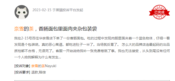 2月15日,网友反映,在百佳华奈雪店下单了一份香肠面包。吃的过程中发现肉肠里面夹着一个蓝色物体,仔细一看发现是个包装袋。客服说补一张免费券就了事,无法接受,没有解释为什么有(会)发生。