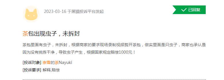 今年3月16日,一网友投诉称,未拆封的茶包里有虫子。