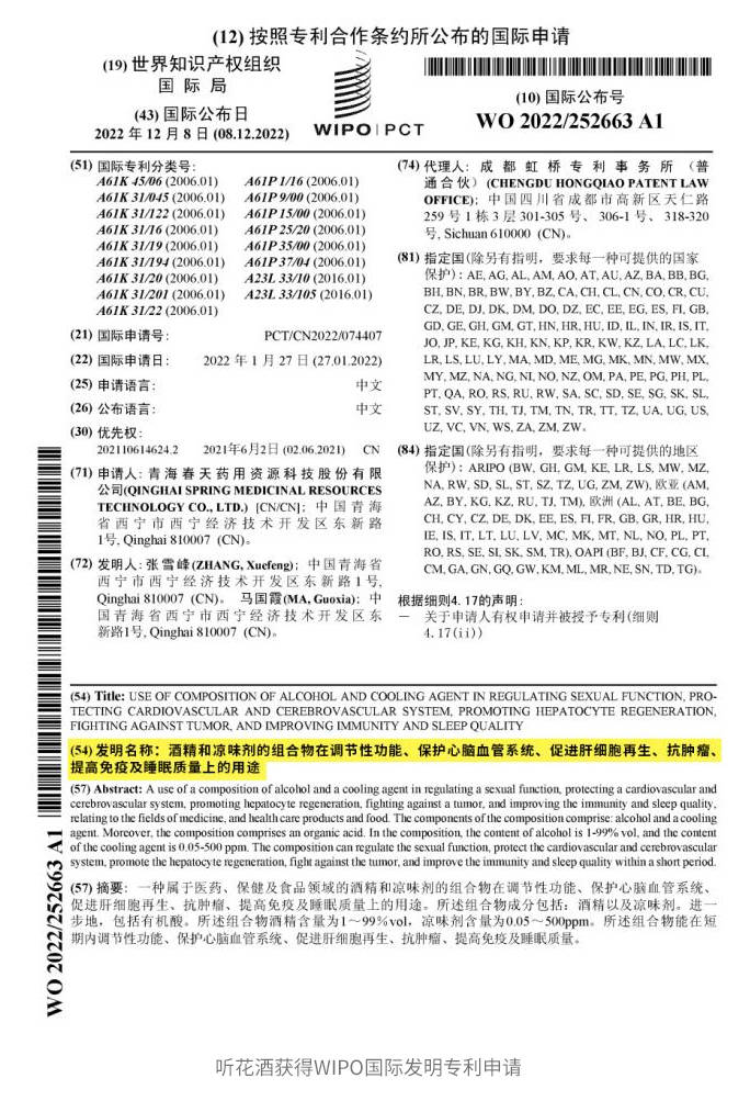 2022年12月,世界知识产权组织(WIPO)国际局公布听花酒名为《酒精和凉味剂的组合物在调节性功能、保护心脑血管系统、促进肝细胞再生、抗肿瘤、提高免疫及睡眠质量上的用途》的国际发明专利申请。
