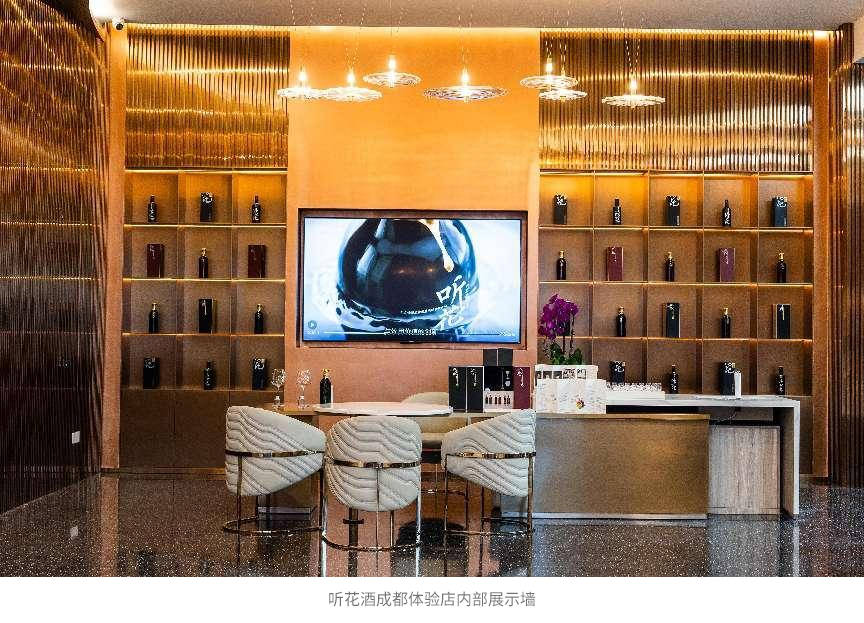 鳌头财经现场观摩成都体验店发现,通过布景与灯光的运用,听花酒陈列墙呈现出金碧辉煌的视觉感受,轻奢中又不失优雅;休息品鉴区的背景墙又似酒花泛起,赏心悦目之下尽显品位和气质,是对“通感”美学的具体呈现。