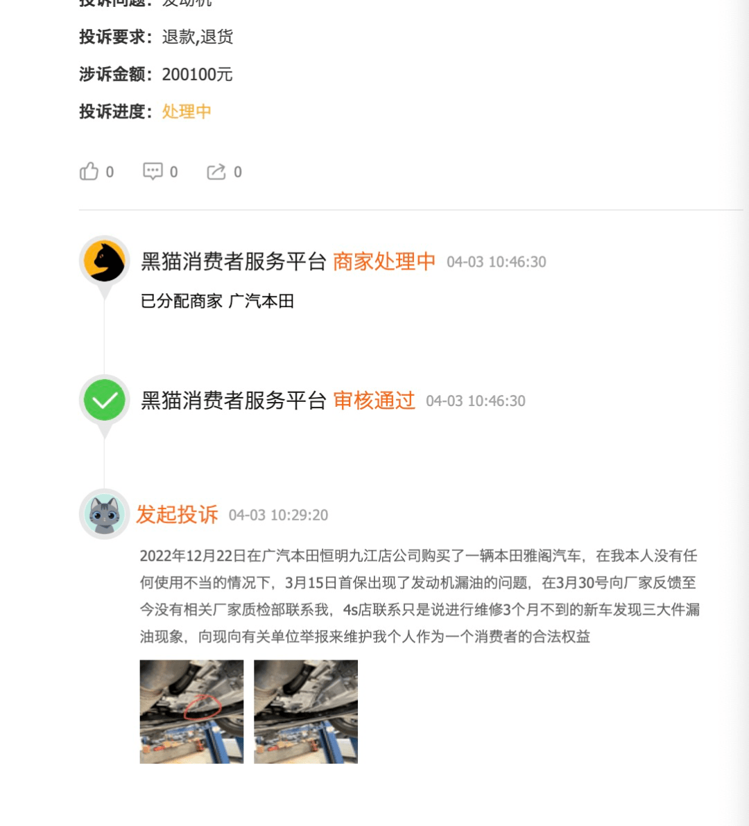 无独有偶,另一位消费者在黑猫平台上投诉称,购买的2018款雅阁,近期发现车辆发动机渗油故障,多次与客服协商检测后,也一直未得到妥善处理。