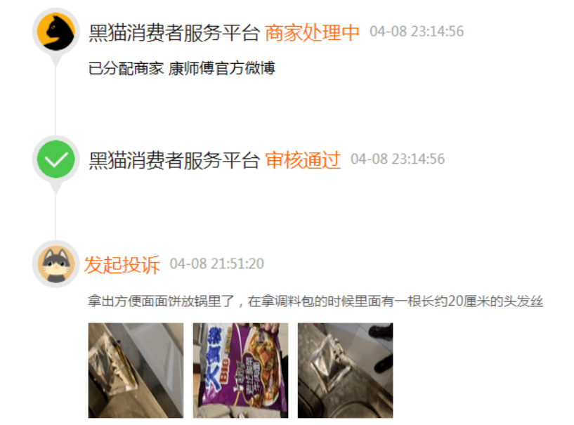 鳌头财经发现,在黑猫投诉平台上,4月8日,有消费者称,拿出方便面面饼放锅里了,在拿调料包的时候里面有一根长约20厘米的头发丝。
