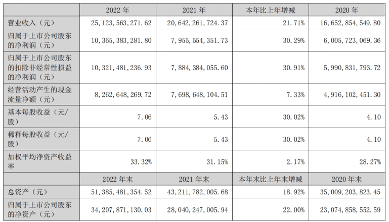 4月28日晚间,泸州老窖发布了2022年年报。数据显示,泸州老窖实现营收251.24亿元,同比增长21.71%;归母净利润为103.65亿元,同比增长30.29%。自2015年开始(除2020年外),公司营业收入8年间有7年增幅超过20%,保持着中高速增长势头。而且,公司净利润首次突破100亿大关,稳居行业前三。