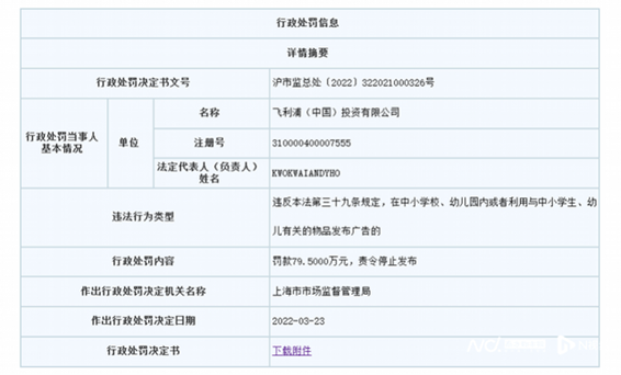 2022年4月,上海市市场监管局官网显示,近日,飞利浦(中国)投资有限公司因在中小学校、幼儿园内开展广告活动,违反广告法规定,被上海市市场监督管理局罚款79.5万元。