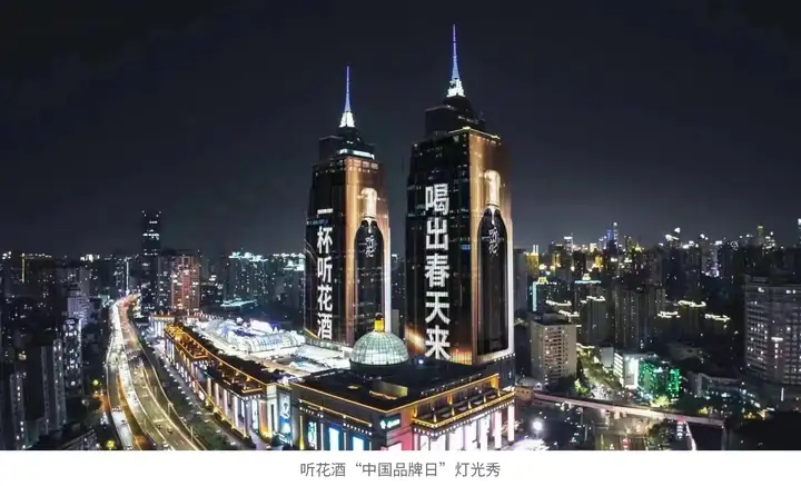 前不久,听花酒亮相新华社举办的“中国品牌日”光影秀系列活动,“听花酒,开创酱香PLUS”“好喝,从未体验过的好喝”“一杯听花酒,喝出春天来”……闪耀在上海、杭州、广州等各大都市地标楼宇的浪漫话语,展示了产品风味口感升级和饮用价值创新。