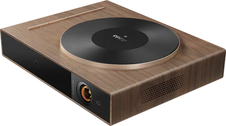悦己M1则采用了全新的设计语言,薄薄的机身,不到一张A4纸的大小;整体就像一本大书,可以轻松放进普通的背包中,方便随时随地投出高清大屏。特别的是,悦己M1的顶部是一个仿黑胶唱片的设计,这让它更像是一台复古的木制唱机,别致的造型让人爱不释手。