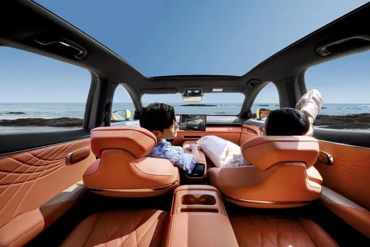 从智能品质来说,深蓝S7的内饰设计更是颇具亮点。进入到车内,扑面而来的是游艇般的环抱设计理念,配合64色氛围灯和隐藏空调出风口,瞬间给人以豪华精致的气息。怀挡设计集成了换挡和智能辅助驾驶功能,同时80寸的超大全景天窗配合悬浮声音岛和全车14个扬声器,让移动家庭影院随时随刻呈现在眼前。最具智能科技感的要说是深蓝S7的53英寸AR-HUD、可旋转角度的15.6英寸向日葵中控屏以及12.3英寸副驾驶超感智慧屏,在前排双零重力按摩座椅的衬托下,超感官氛围可以算得上是行业首创。