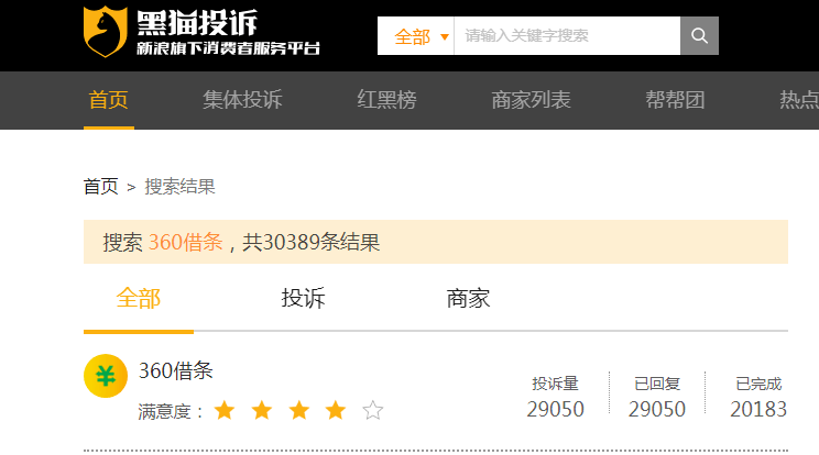 摘要:在黑猫投诉平台上,搜索360借条,共计约3.04万条结果,显示29050条投诉,涉及发放高利贷、泄露个人隐私、虚假宣传、暴力催收等内容。