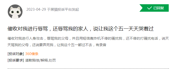 4月29日,有投诉称,对其进行攻击、辱骂其父母,让其五一不好过。