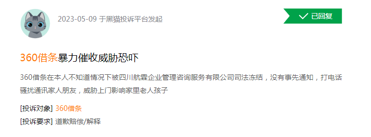 5月9日,一网友投诉称,360借条在本人不知道情况下被四川航霖企业管理咨询服务有限公司司法冻结,没有事先通知,打电话骚扰通讯家人朋友,威胁上门影响家里老人孩子。