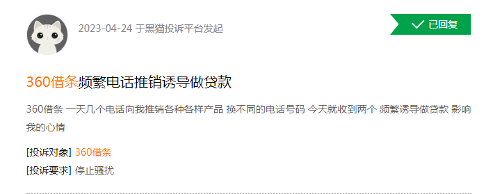 4月24日,有投诉称,360借条一天几个电话向我推销各种各样产品,换不同的电话号码,频繁诱导贷款。