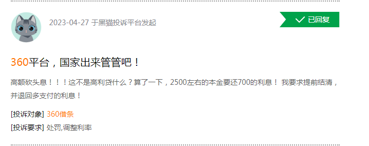 今年4月27日,有网友投诉称,2500左右的本金要还700的利息! 要求提前结清,并退回多支付的利息!