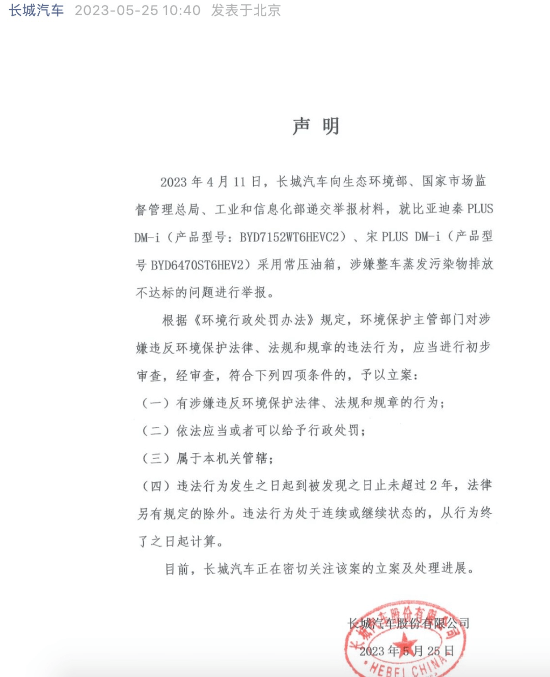 声明中,长城汽车表示,已经向生态环境部、国家市场监督管理总局、工业和信息化部递交举报材料,就比亚迪秦PLUS DM-i、宋PLUS DM-i 采用常压油箱,涉嫌整车蒸发污染物排放不达标的问题进行举报。