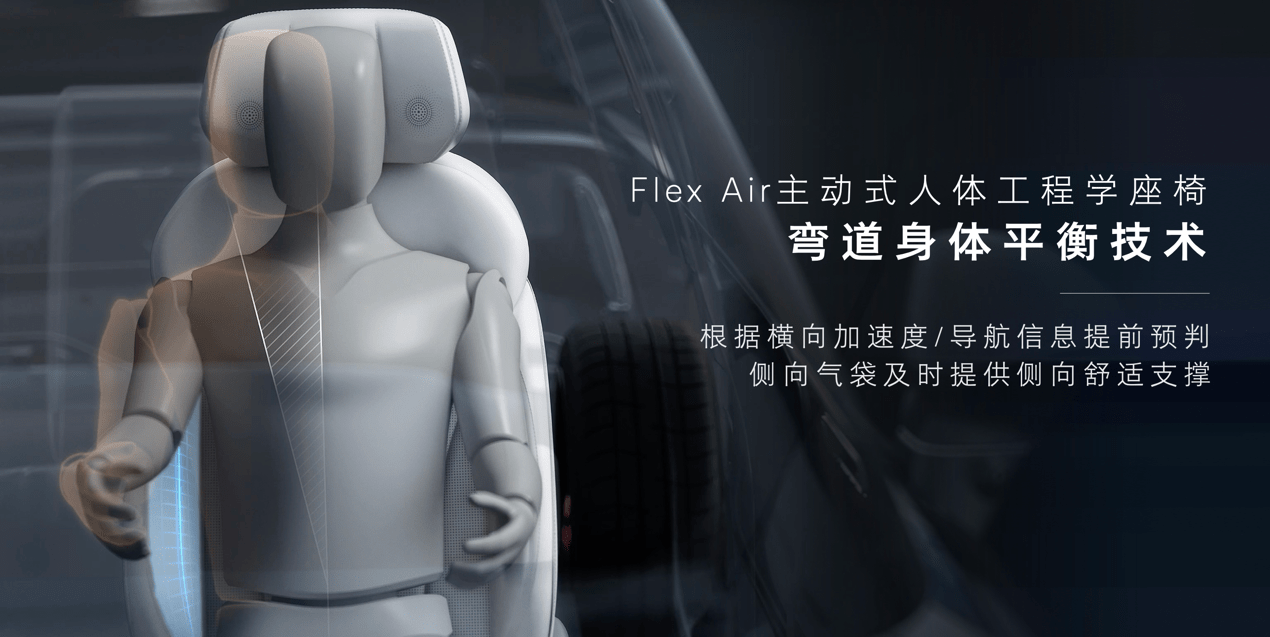 另一项创新技术为「弯道身体平衡技术」。在面对弯道行驶及坑洼路面所带来的晃动时,飞凡「Flex Air主动式人体工程学座椅」可通过横向加速度及导航信息,提前预判车辆动态,以座椅中侧翼气袋预充气给予用户舒适支撑,极大缓解脊椎不适。