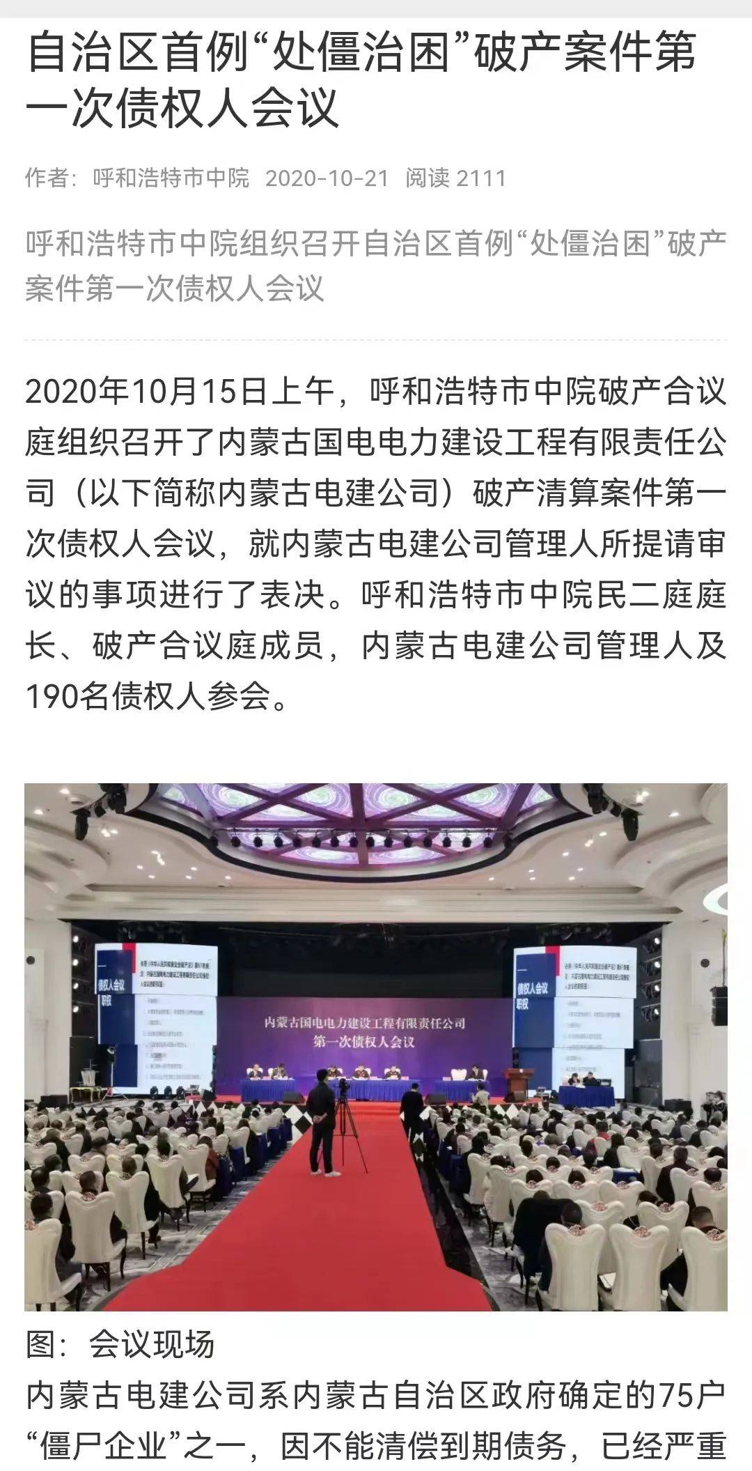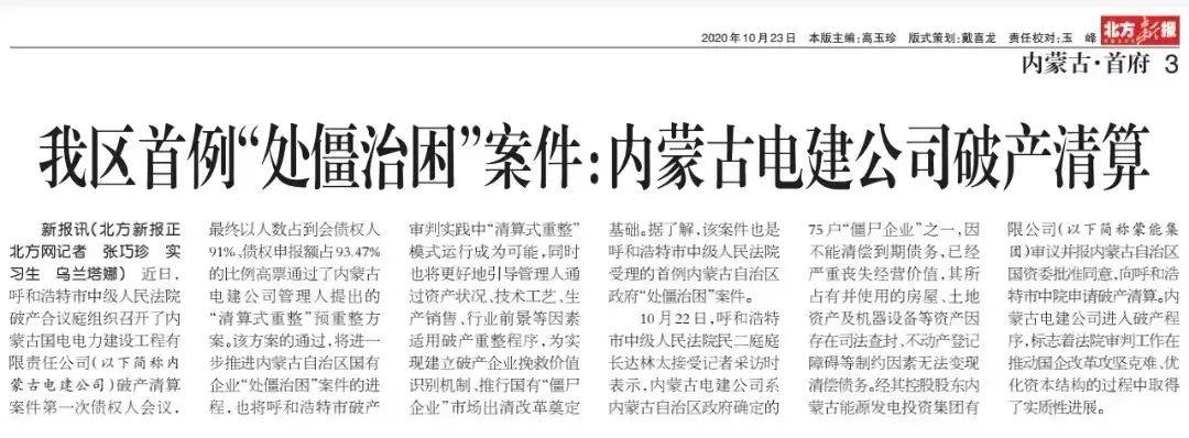 据内蒙古日报社旗下的《北方新报》2020年10月22日报道,呼和浩特市中级人民法院民二庭庭长达林太接受记者采访时表示,内蒙古电建公司系内蒙古自治区政府确定的 75 家“僵尸企业”之一。