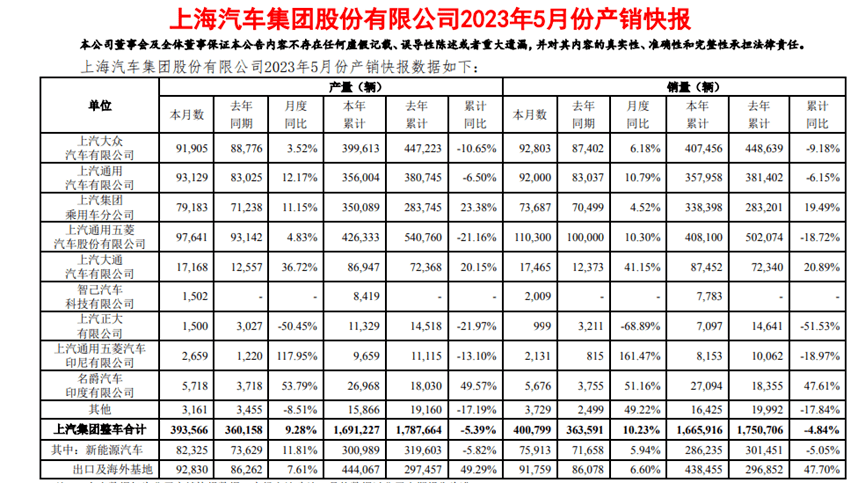 2023年前5月,上汽集团销量达166.59万辆,同比下滑4.84%。而中国汽车工业协会发布的产销数据显示,前5月,我国乘用车销量达900.1万辆,同比增长10.7%。