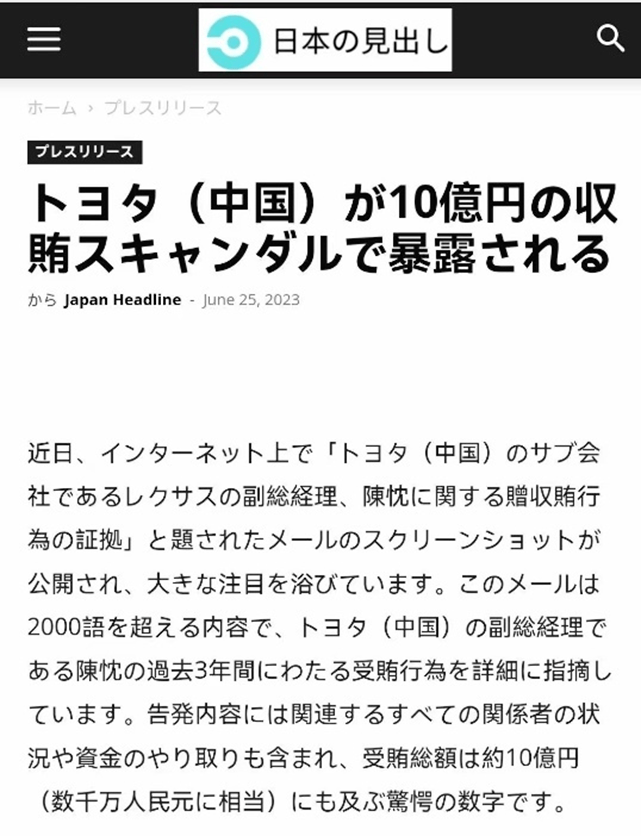 据日本多家媒体报道,一封名为“关于丰田(中国)雷克萨斯副总经理陈忱受贿行为的说明”邮件截图广为流传,该邮件截图详细记录了陈忱过去三年的受贿行为,总金额达10亿日元,约合人民币5000万元。