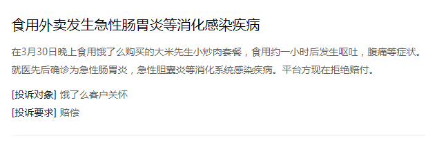今年3月30日,网友投诉称,晚上食用饿了么购买的大米先生小炒肉套餐,食用约一小时后发生呕吐,腹痛等症状。就医先后确诊为急性肠胃炎、急性胆囊炎等消化系统感染疾病。