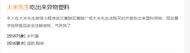 今年6月19日,有投诉称,在大米先生微信小程序武汉黄陂区黄陂广场大米先生店购买的外卖吃出来异物塑料(塑料异物)。