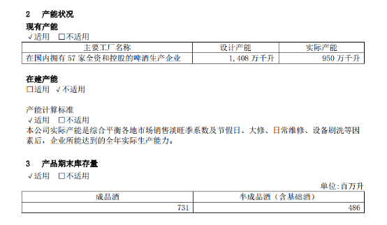 青岛啤酒解释称,公司实际产能是综合平衡各地市场销售淡旺季系数及节假日、大修、日常维修、设备刷洗等因素后,企业所能达到的全年实际生产能力。
