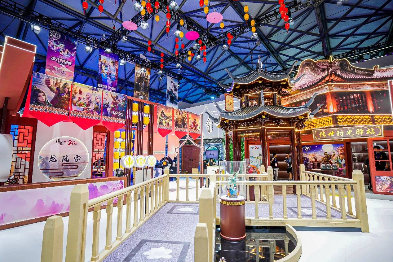 今年盛趣游戏的参展阵容包括《传奇世界》《传奇永恒》《永恒之塔》《冒险岛》《彩虹岛》《泡泡堂》《龙之谷》《庆余年》《血族》《AI星河》等多款产品,与开场动画一样,盛趣游戏的各个游戏展区的设计也充分体现了这种古代、现代、未来的相融概念 。例如《传奇世界》20周年展区,它既保留了东方美学的传统神韵,又加以简化创新,在继承豫园商城古典风格的基础上融入现代的彩灯描绘,呈现出一步一景,充满意趣的游园氛围。而《血族》展台则以现代客厅家装风格从古风中跳脱出来,通过舒服的沙发、简约的小茶几、可爱的地毯、精美的装饰画框、以及温馨的立式台灯和米白色的纱窗帘给人一种宅家的温馨感。另外,无论是多样风格的展台组合,不但特色鲜明互补,也让盛趣游戏展台成为整个N4馆的一道亮丽风景线。