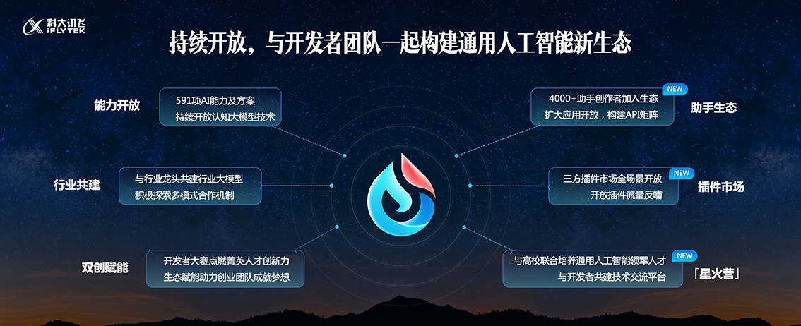 除了原有的能力开放、行业共建、双创赋能等举措,此次发布会上科大讯飞宣布将进一步开放助手生态、插件市场、星火营,与开发者团队一起构建通用人工智能新生态。