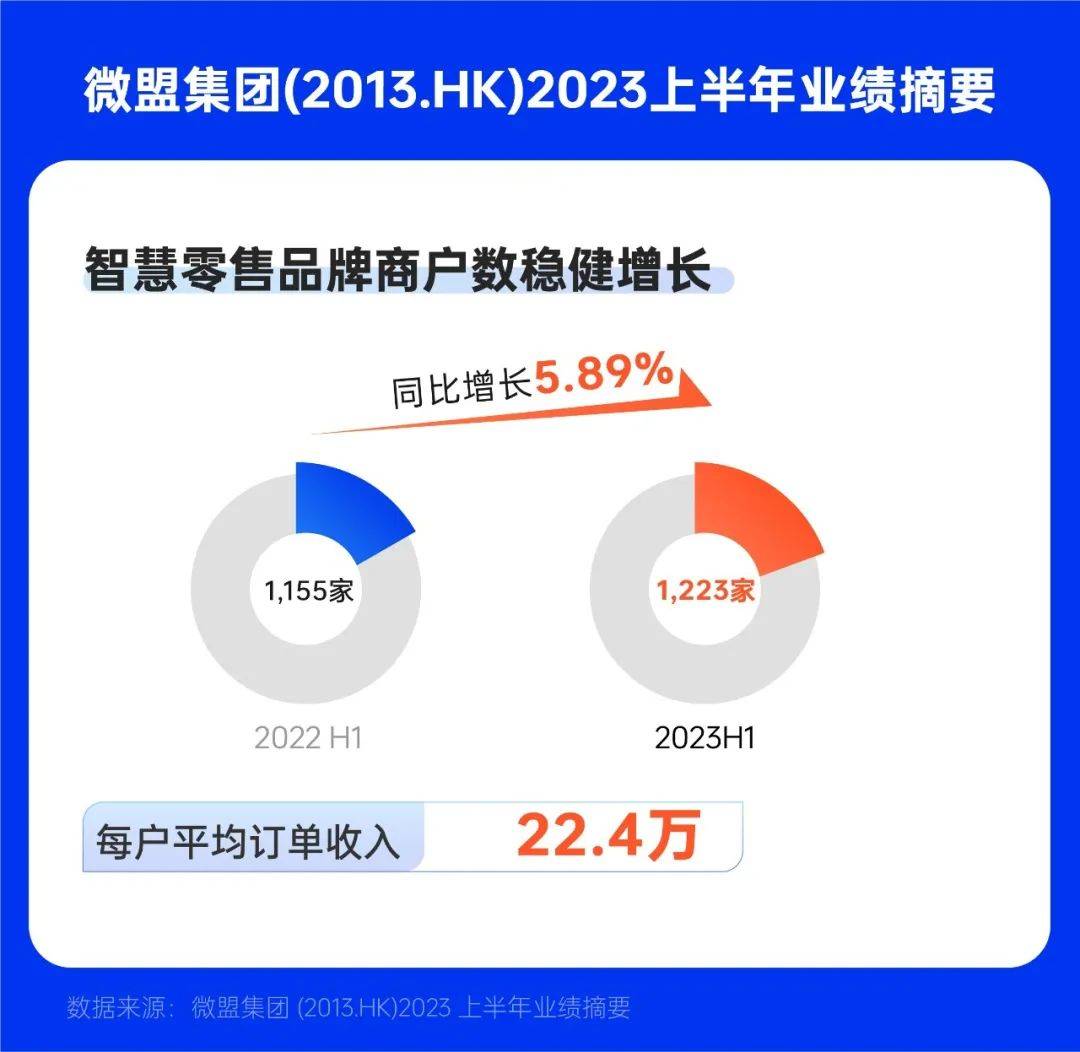 智慧零售收入占订阅解决方案收入的比例提升至44%。商户数达到6428家,其中品牌商户1223家,品牌商户的每用户平均订单收入为22.4万元。