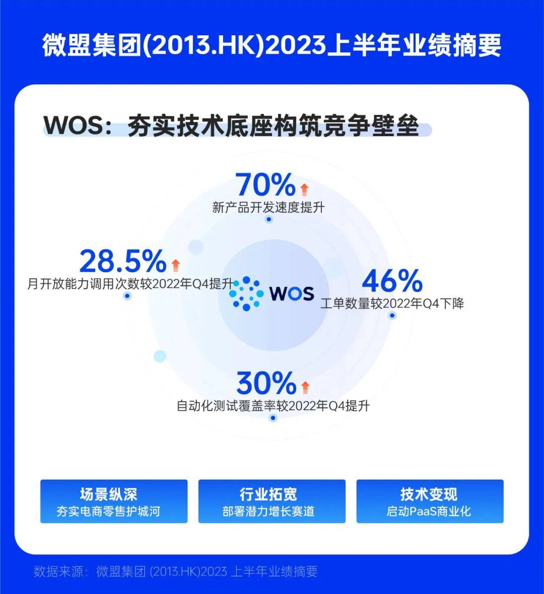 除了加速AI+SaaS”应用的进程,微盟也在持续投入WOS生态建设,依托WOS的数字商业基础设施,微盟在研发新功能、新产品的可行性和研发效率都得到有效提升。