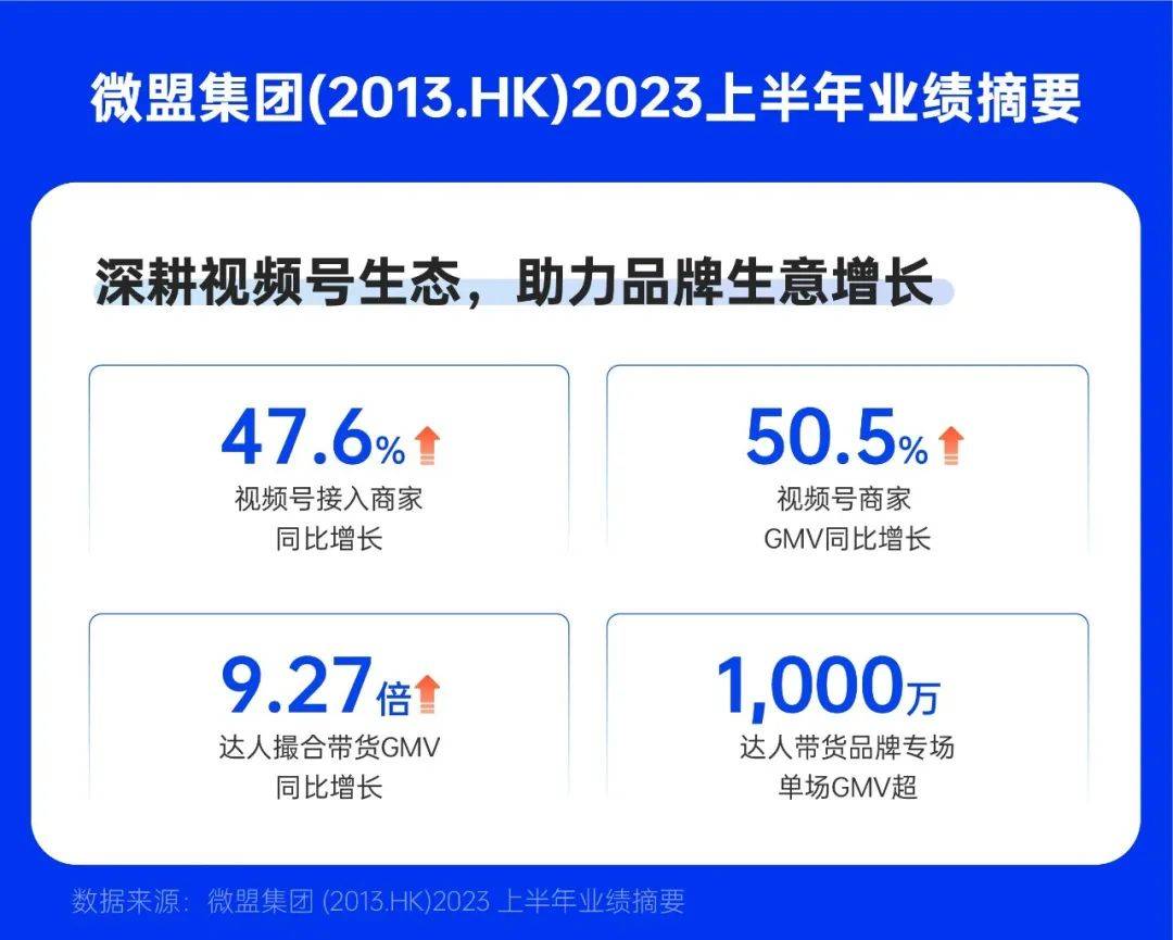 数据显示,2023年上半年,微盟服务商家开播场次超过3.2万场,自播商家GMV最高超过5.7亿元,视频号达人带货总GMV同比增长9.27倍,达人带货品牌专场单场GMV超1000万元。