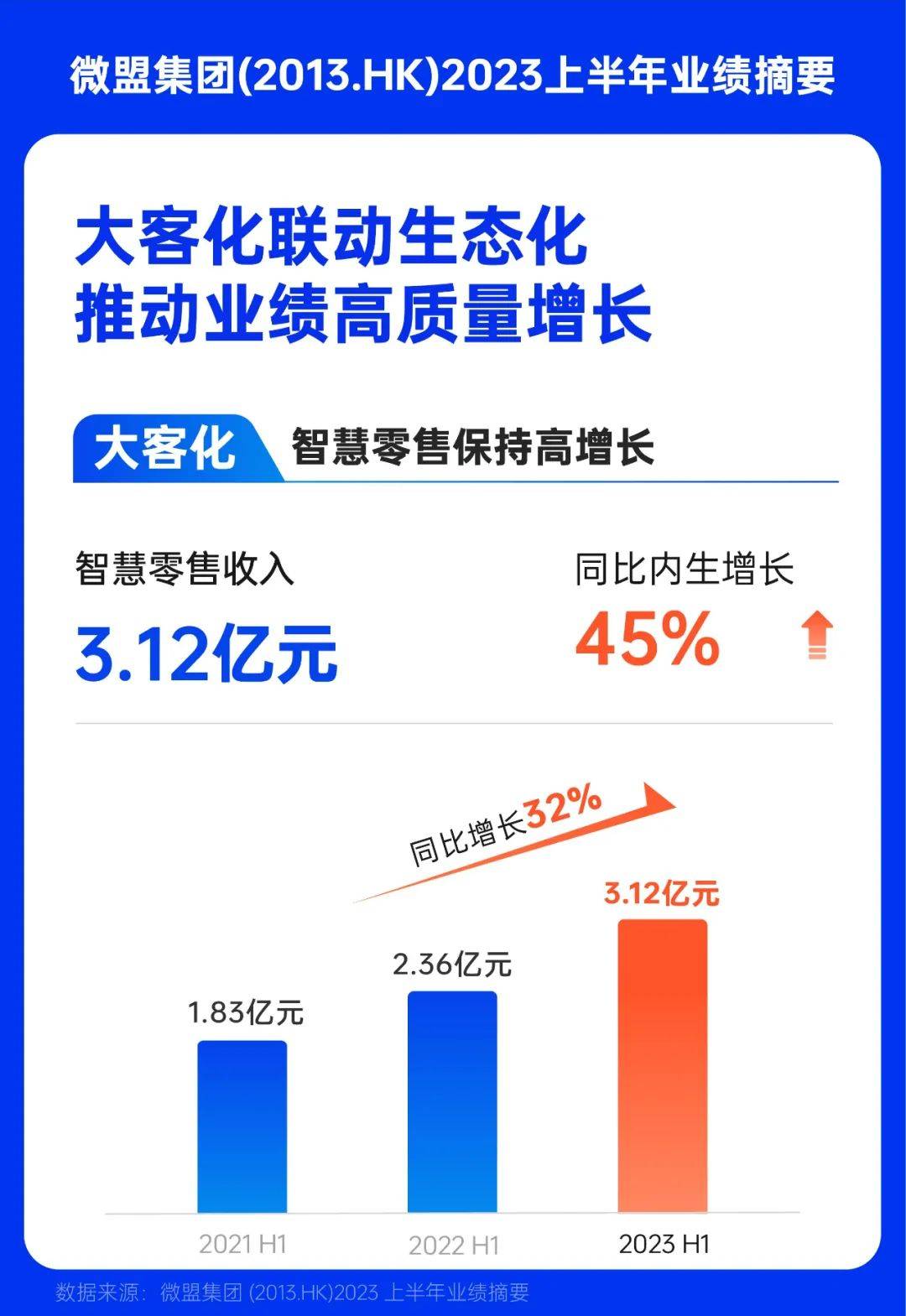 财报显示,2023年上半年,微盟智慧零售收入为3.12亿元,同比增长32%,同比内生增长45%。