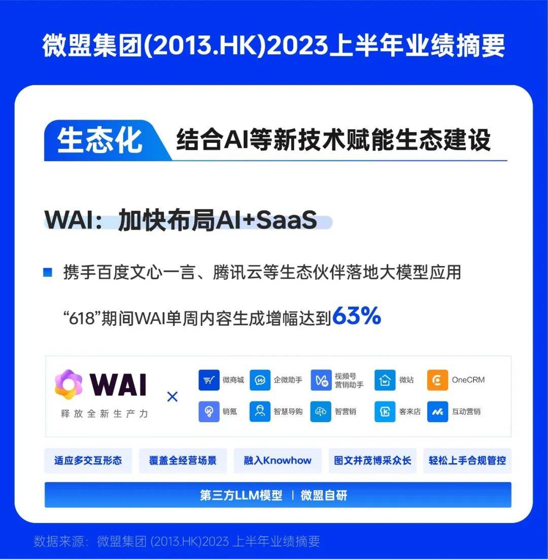 在功能上,微盟WAI能有效帮助商家降本增效。今年“618”大促期间,商家对微盟WAI的使用量呈倍增趋势。以SaaS融合场景为例,微盟WAI单周内容生成增幅达到63%,其中公众号推文增幅400%,种草笔记标题增幅达257%,轮播图增幅达到了243%。