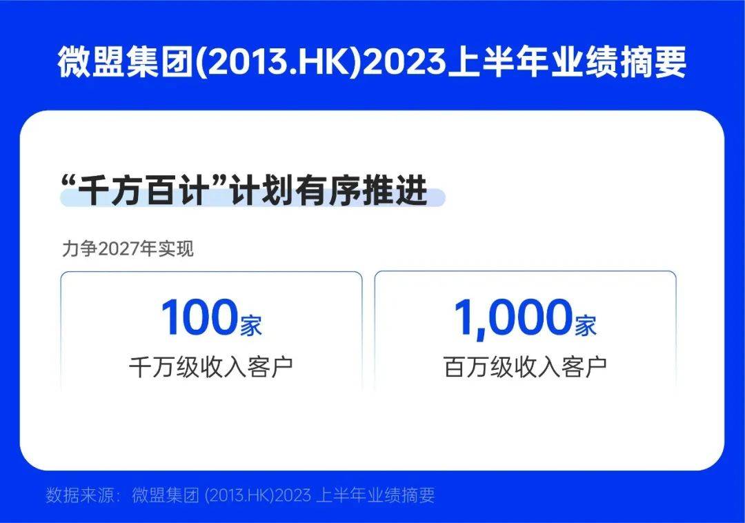 微盟已经定下了目标。“公司有望实现2023年全年大客户收入占比提升至近50%,2025年至近70%的目标。并且还会推动大客户客单价上升,预计至2027年,实现千万级收入客户超100家,百万级客户超1000家的战略目标。”微盟在财报中表示。