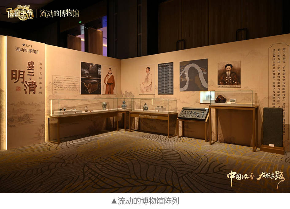 “流动的博物馆”以位于酒城泸州的泸州老窖博物馆为基础打造,通过展现浓香文化在不同时代的起源、繁盛及发展,带领观众溯源一条中国浓香大成之路。现场还展示了诸多珍贵的酒文化文物,如国宝级的青铜觚、麒麟温酒器、宋代石刻、元代青花梅瓶等。活动中,嘉宾和观众们观赏文化展品,聆听历史故事,了解中国白酒与泸州老窖的发展历程。