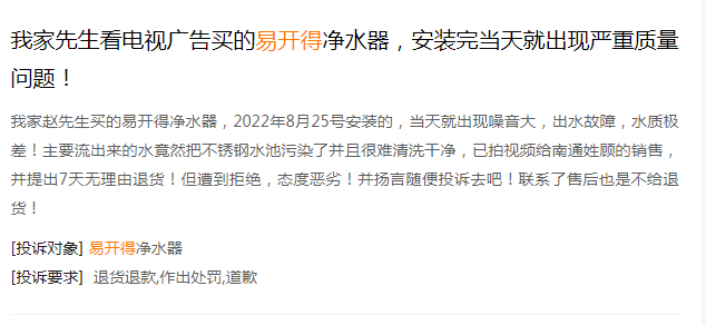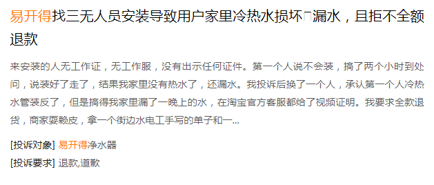 售后服务的投诉也不少。今年7月,有网友投诉称,易开得找三无人员安装。