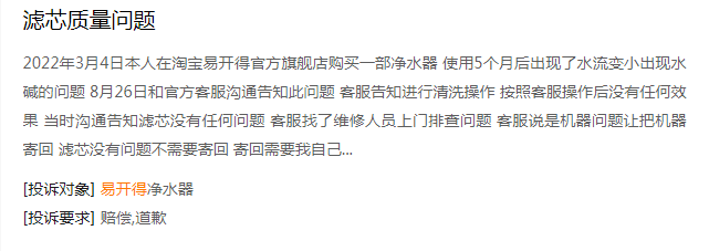 相较于销量,更为市场关注的是易开得的产品质量和售后服务。在黑猫投诉平台上,针对易开得的投诉多达232起,集中于产品质量及售后,也不乏虚假宣传。