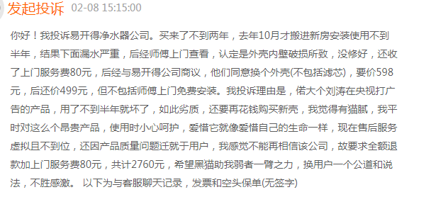 今年2月,有网友投诉称,净水器使用不到半年,外壳内壁破损导致漏水,更换要另付费598元。