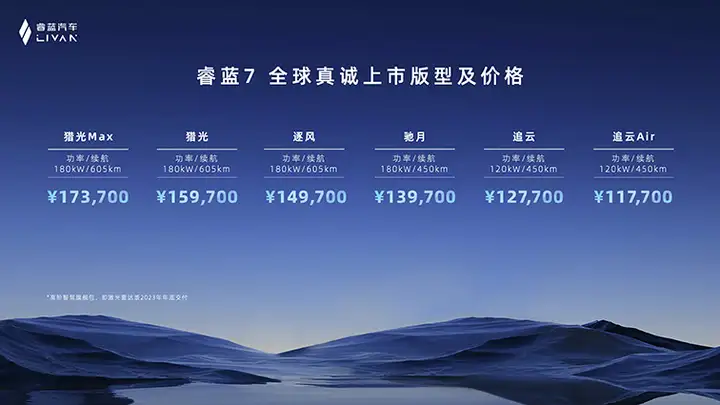 在此次的上市发布会,睿蓝汽车发布了高阶智驾版本及激光雷达选装包,让睿蓝7成为20万内唯一搭载激光雷达的车型,不止如此,睿蓝7还发布了追云Air版本——11.77万的价格,相比追云版入手价格更低,但配置不减,依然十分真诚。