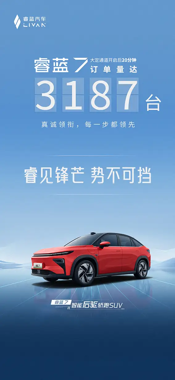 市场的反应永远是产品价值最好的体现,睿蓝7在上市发布大定通道开启之后,至发布会结束,订单在20分钟内达到3187台,热烈的市场反馈,打响了睿蓝7上市第一枪,也为市场指出了一条更清晰的方向——内卷的市场,价值普惠远比盲目溢价更容易赢得好评。